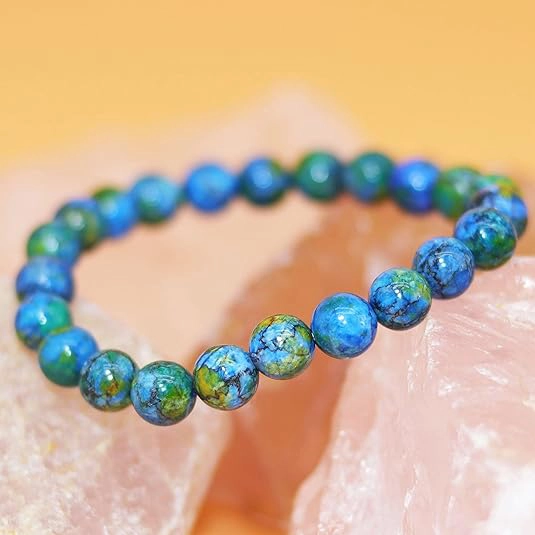 This blue azurite bracelet features natural stone beads with rich blue tones and unique green patterns, making each piece one of a kind. Its deep color reflects calmness, depth, and quiet strength.