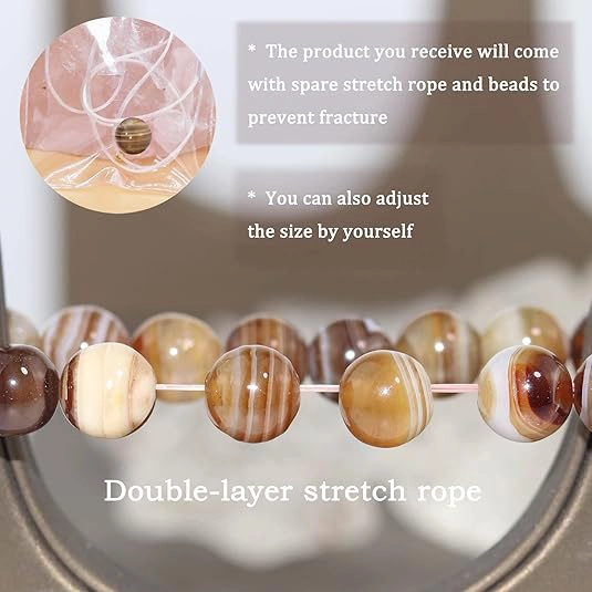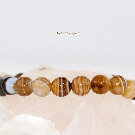 This botswana agate bracelet is crafted from natural 8mm stone beads, known for its calming energy and emotional balance. With its soft brown, beige, and white banded patterns, it offers a unique and earthy aesthetic.
